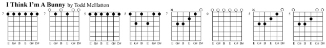Play Along!After numerous requests from both experienced and budding musicians all over the world I humbly offer up to you the chords and tuning for “I Think I’m A Bunny”. The special tuning, low to high is: E, G#, B, E, G#, D#.